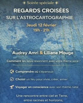 Deux astrologues, Audrey AMRY et Liliane MOUGE présenteront un regard croisé sur l’astrocartographie et répondront aux questions : Comment les lieux résonnent avec votre thème astral ? Comprendre ou s’épanouir.